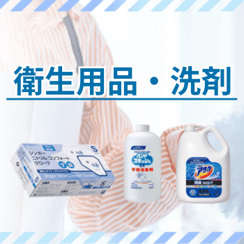 洗剤や消毒用品、手袋、マスクなど、衛生管理に関するアイテム